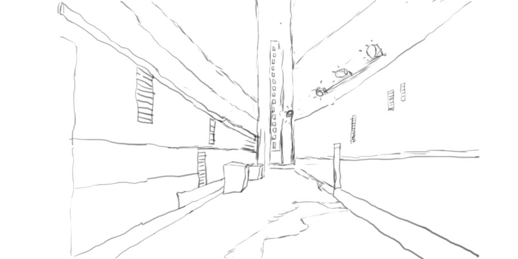 To create the drawing, I collected some art references – these are photos of alleyways. If you Google “Alleyways at night”, you will get a few photos.
