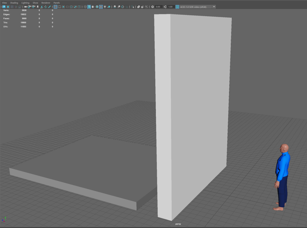 I create a cube and also put in a person in the scene so that I can build the wall to a size that I want which will be about 4m x 2m. The person came from Maya as it comes with some existing models (under the content browser).