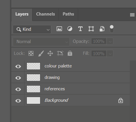 I created a new file 2000 px X 1000px with 96 dpi. Then I imported the references into one layer. I created a drawing layer and a colour palette layer.