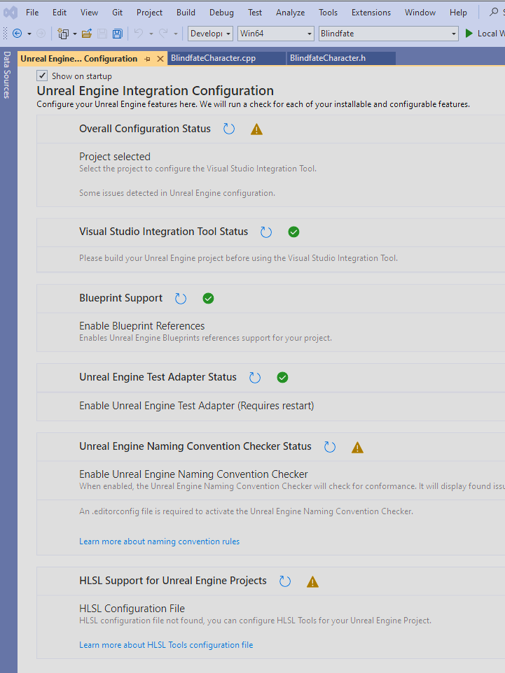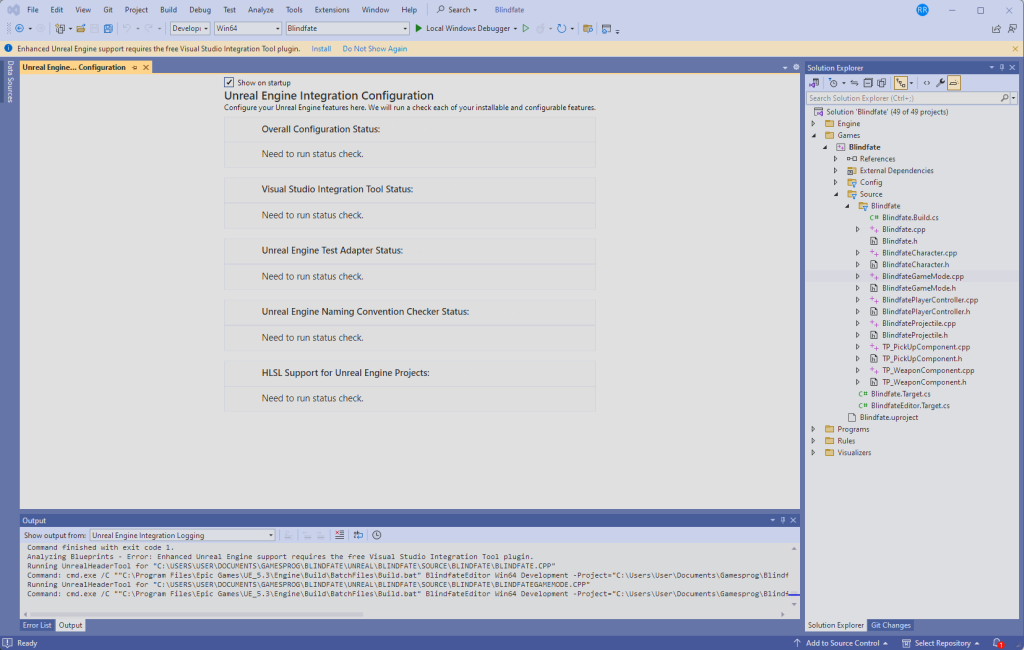 Because I chose a C++ project, Unreal it brings up the Visual Studio screen. You can also do this in Unreal on the menu by clicking on Tools -> Open Visual Studio