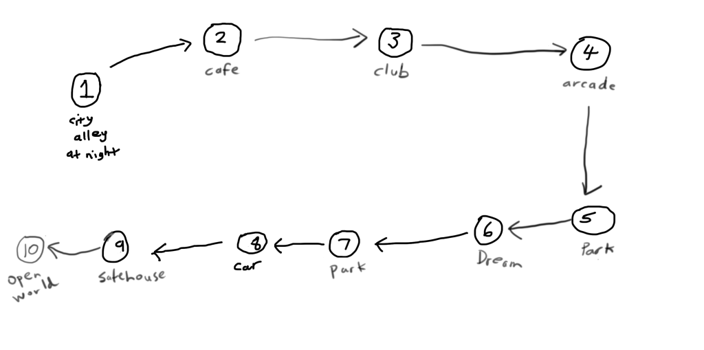 While he/she sleeps, he/she dreams about an element of his/her past. It is very hazy. Ben’s/Tash’s dream consists of people laughing, then he/she is at a police station as a detective trying to solve a mystery. Ben/Tash can walk around the station. He/she goes to his/her desk, and sees his/her badge, a photo of a woman/man and some case files. He/she has a file about the “Syndicate”, a secret underground organisation. Suddenly he/she is in a dark interrogation room, sitting in a chair with a light swinging above.