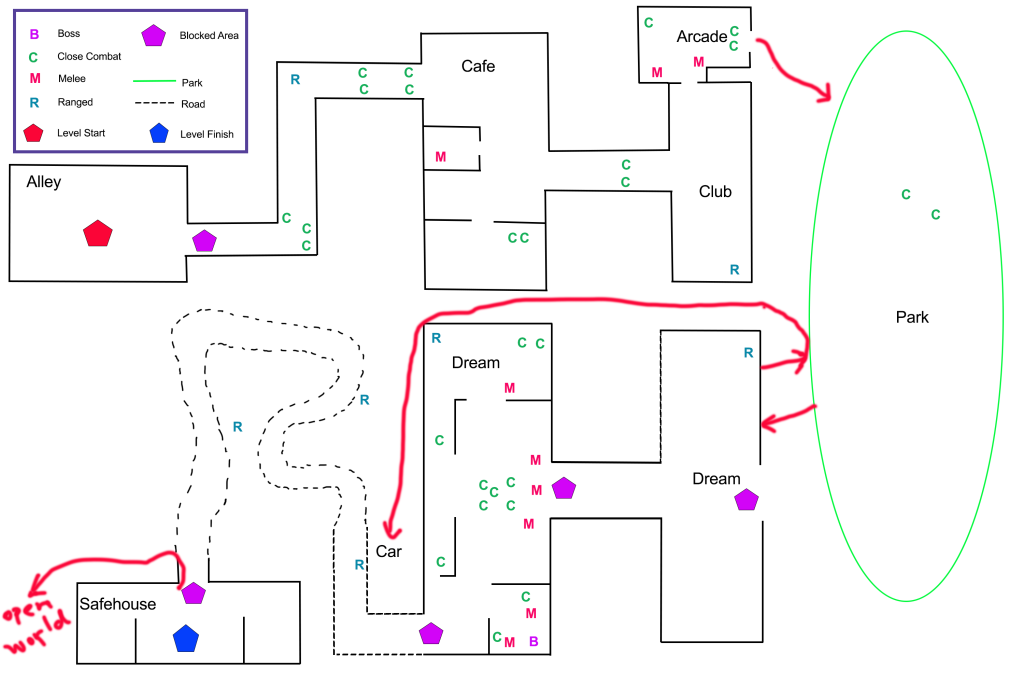 This could be an example level map based on the scenario above showing the gameplay with enemies that the player will engage with. The actual game could differ, but it’s an initial start.